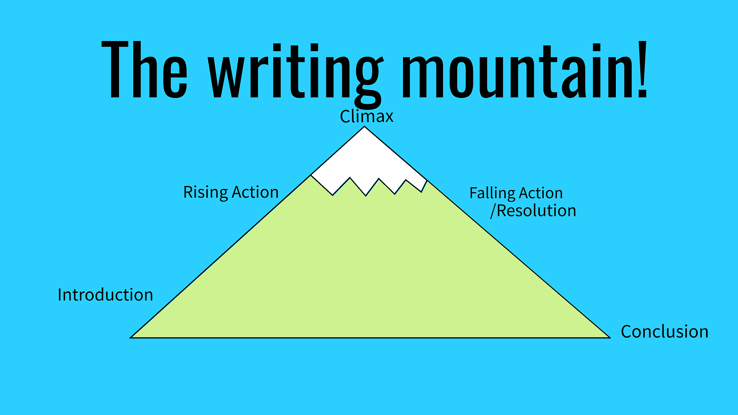 You can think of the five parts as a “mountain”, where you start from the base of the mountain, and work your way up, until the climax, which is like the “peak”. From there, you will work your way down, all the way until the conclusion, where you will reach the base again.